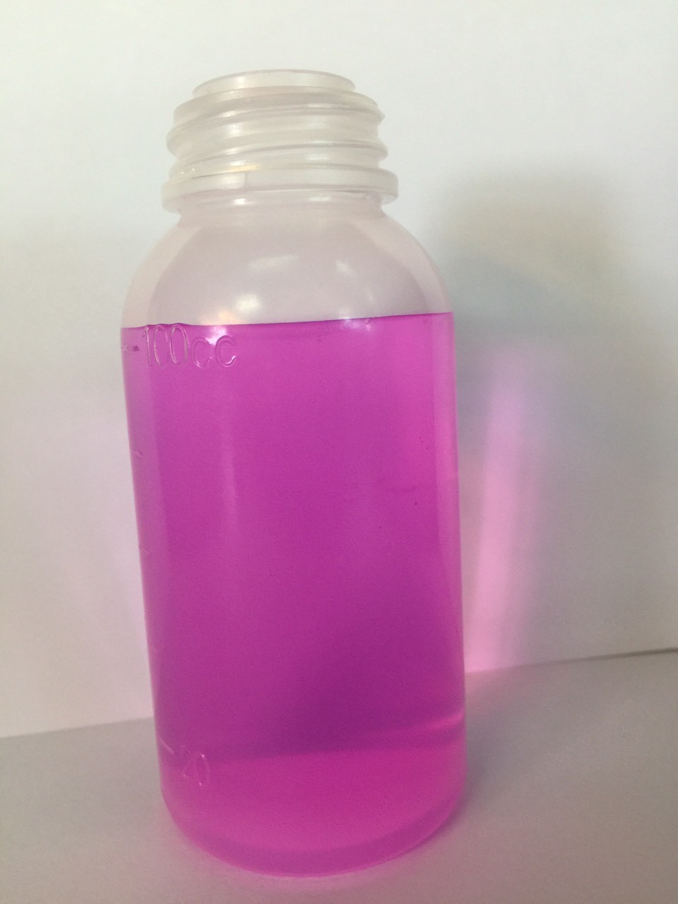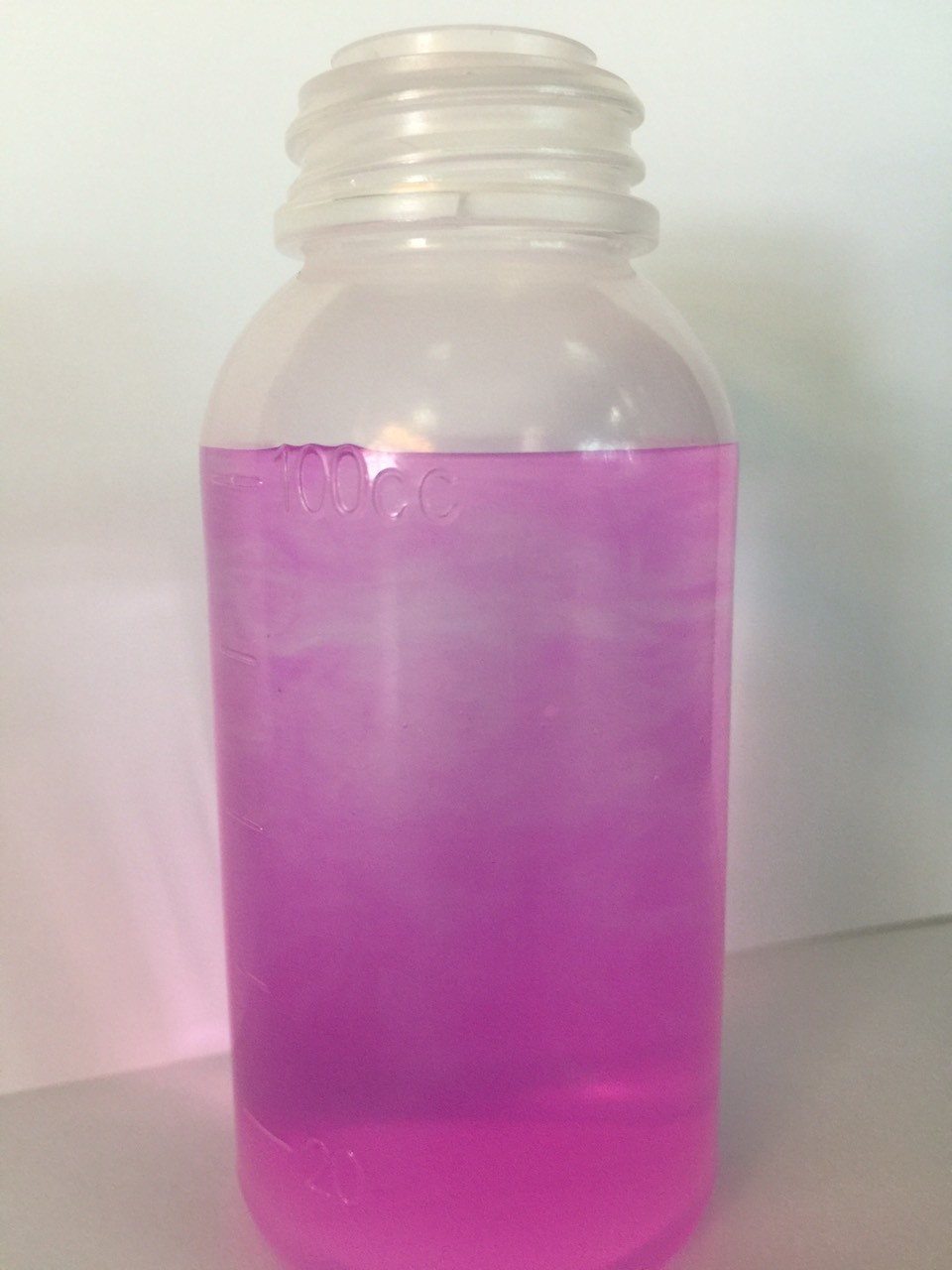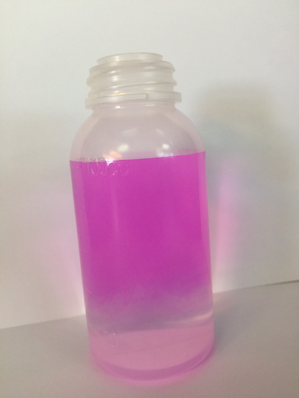 2.1 取空白瓶裝100ml洗碗機水槽液到100ml刻度線(見右圖左)。滴入洗劑濃度指示劑1~3滴,洗碗機水槽液中若含有洗碗機洗劑,水樣呈粉紅色。(見右圖右)
