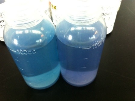 6.3 水樣硬度滴定終點為藍紫色 (見下圖右),與水樣中不含硬度 (為藍色,見下圖左),顏色不太一樣。作水樣硬度滴定時,不需滴到完全變成藍色 (見下圖左),只要滴到顏色接近即可 (見下圖右)。